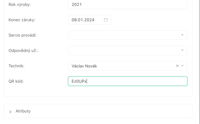 Chcete-li k zařízení přiřadit samolepku s QR kódem, vyplňte do atribut QR kód jednoznačný identifikátor , který je uvedený v levém horním rohu samolepky.