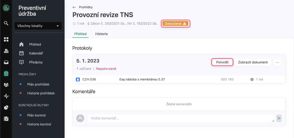 Pro případ, kdy je nutné potvrzovat přijetí protokolu z prohlídky odpovědnou osobou, je možné využít funkci Potvrzení protokolu prohlídky.