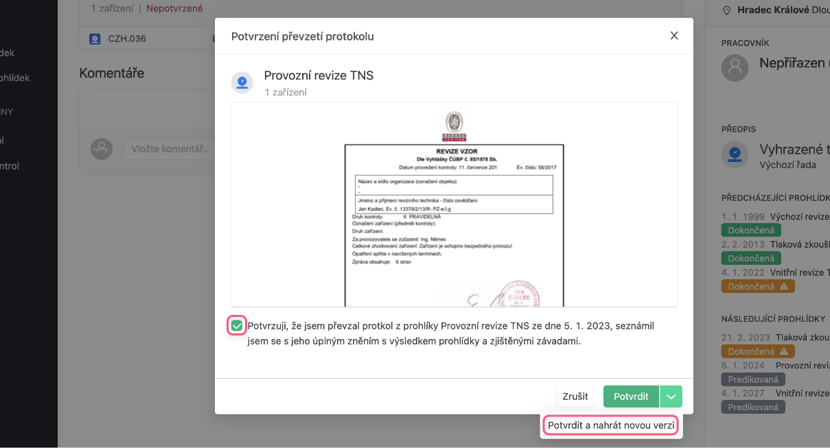 Možnost nahrát novou verzi dokumentu protokolu prohlídky s potvrzením o přijetí.