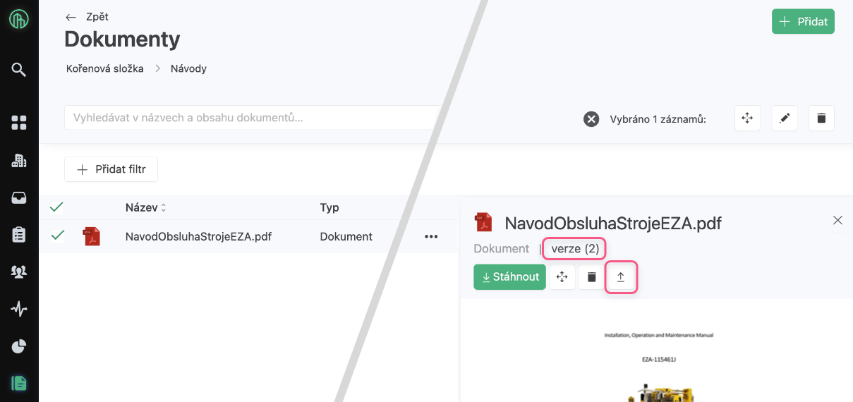Přidali jsme možnost nahrát novou verzi dokumentu. V evidenci dokumentů můžete nahrát novou verzi dokumentu.