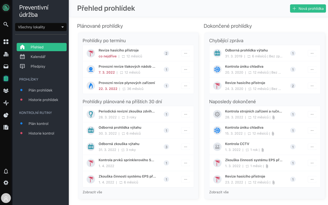 V modulu Preventivní údržba je možné zobrazit Přehled prohlídek. Tento přehled je rozdělen na dvě části Plánované prohlídky a Dokončené prohlídky.