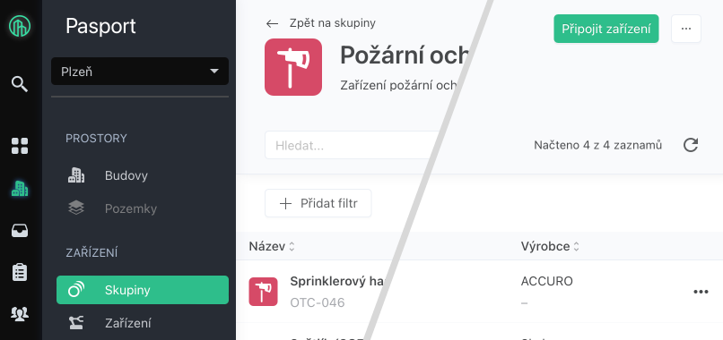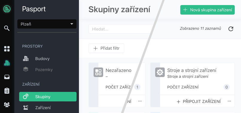 V evidenci Pasport/Skupiny zařízení na kartě skupiny stiskněte tlačítko „Připojit zařízení“
