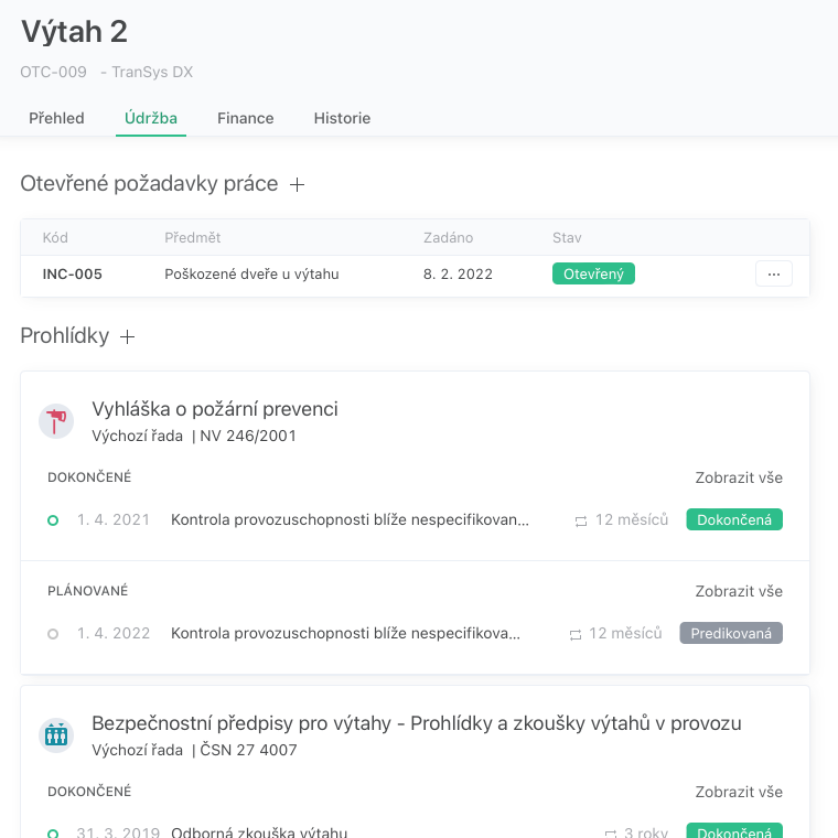V detailu zařízení (modul Pasport) v záložce Údržba jsou zobrazené: