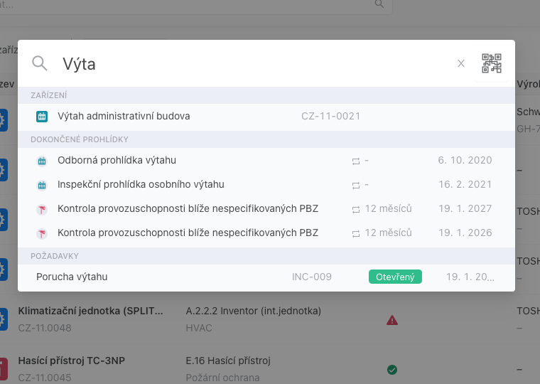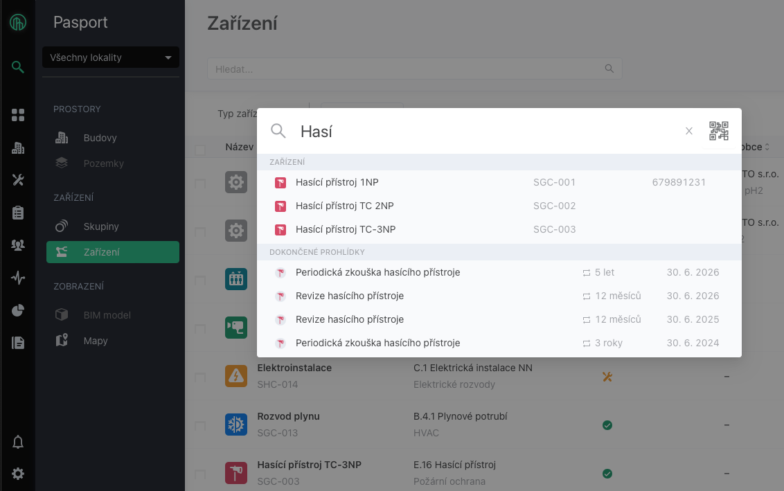 Globální vyhledávání umožňuje hledat záznamy napříč aplikací v entitách Budova, Prostor, Zařízení, Požadavek, Prohlídka a Kontrola.
