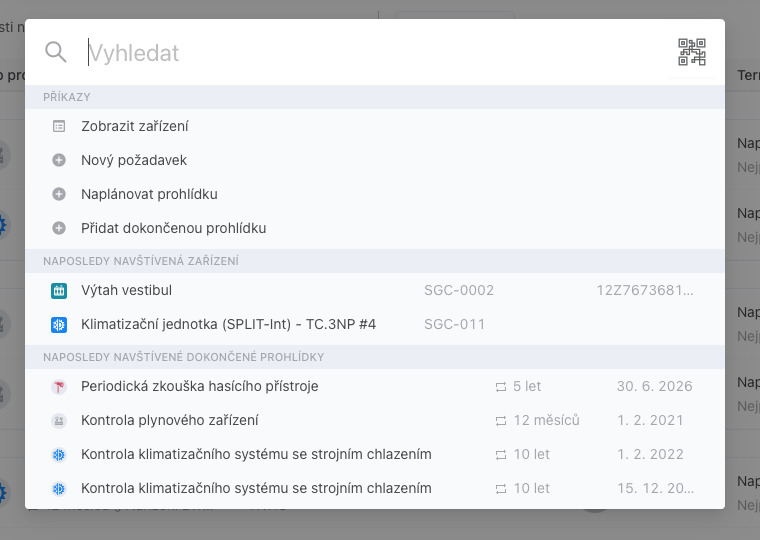 Než začnete vyhledávat jsou v dialogu zobrazeny připnuté příkazy, posledně navštívené zařízení a posledně navštívené prohlídky.