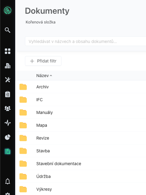 V modulu Dokumenty jsou k dispozici všechny dokumenty, které jsou přiřazené k jednotlivým entitám, jako budovy, prostory, požadavky prohlídky a kontroly. Kromě toho je možné v modulu evidovat i zatím nepřiřazené dokumenty. Jednotlivé dokumenty lze organizovat do složek.